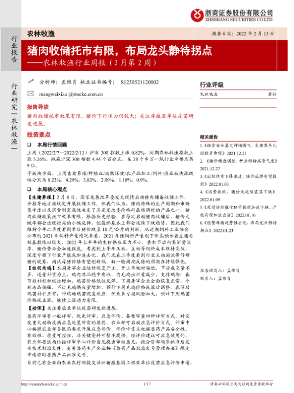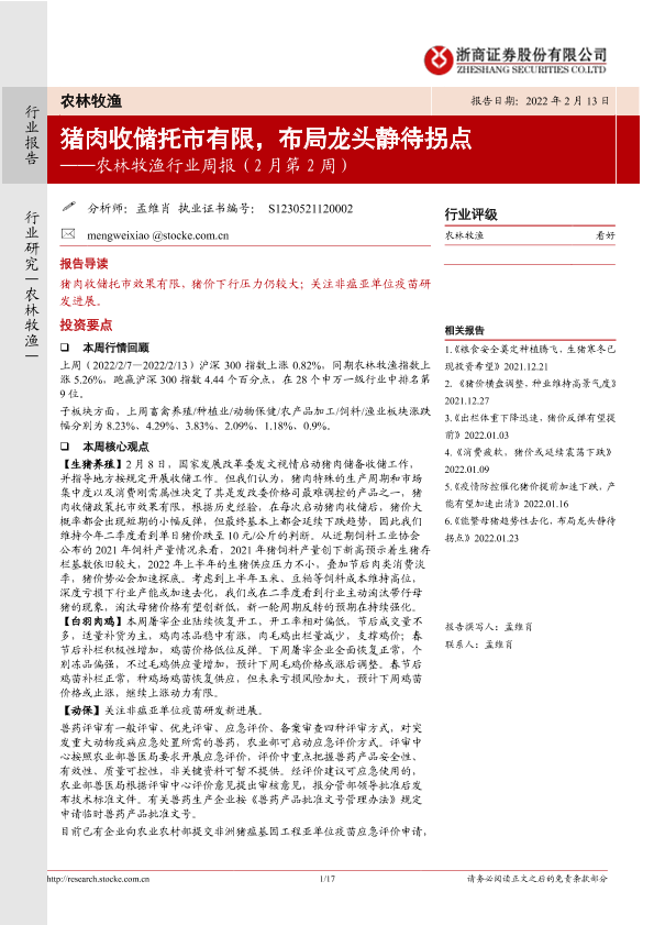 【浙商证券】【20220213】20220213-浙商证券-农林牧渔行业周报(2月第2周):猪肉收储托市有限,布局龙头静待拐点-17页