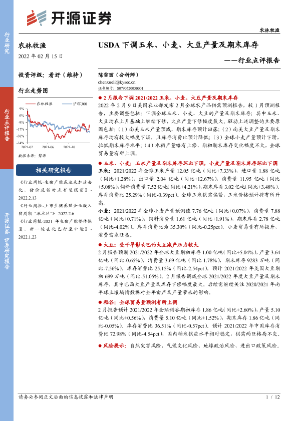 【开源证券】【20220215】农林牧渔行业点评报告:USDA下调玉米、小麦、大豆产量及期末库存-12页