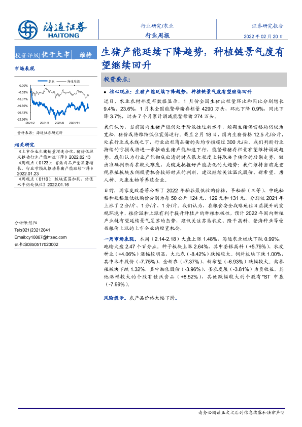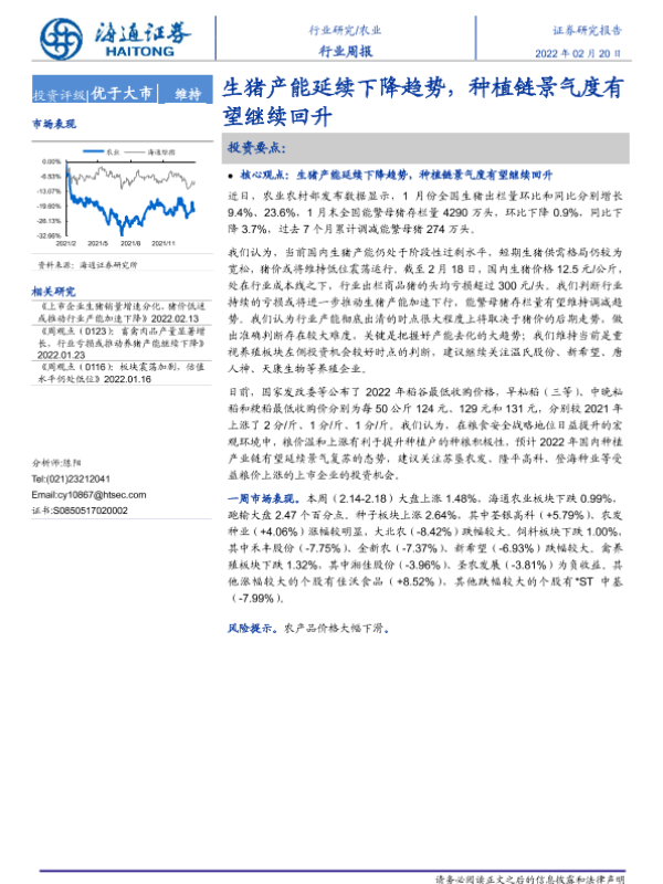 【海通证券】【20220220】20220220-海通证券-农业行业周报:生猪产能延续下降趋势,种植链景气度有望继续回升-4页