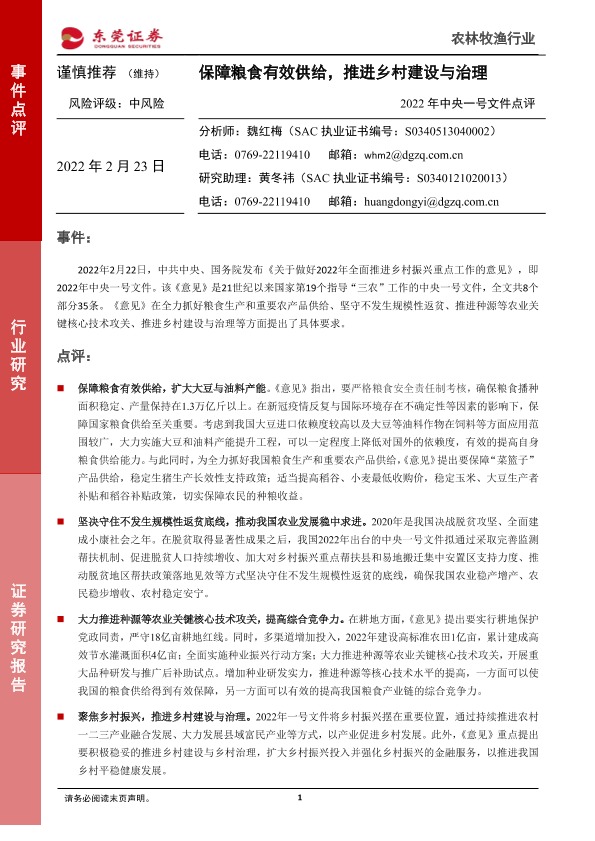 【东莞证券】【20220223】农林牧渔行业2022年中央一号文件点评:保障粮食有效供给,推进乡村建设与治理-3页