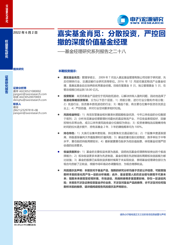 【申万宏源】【20220602】嘉实基金肖觅:分散投资,严控回撤的深度价值基金经理-20页