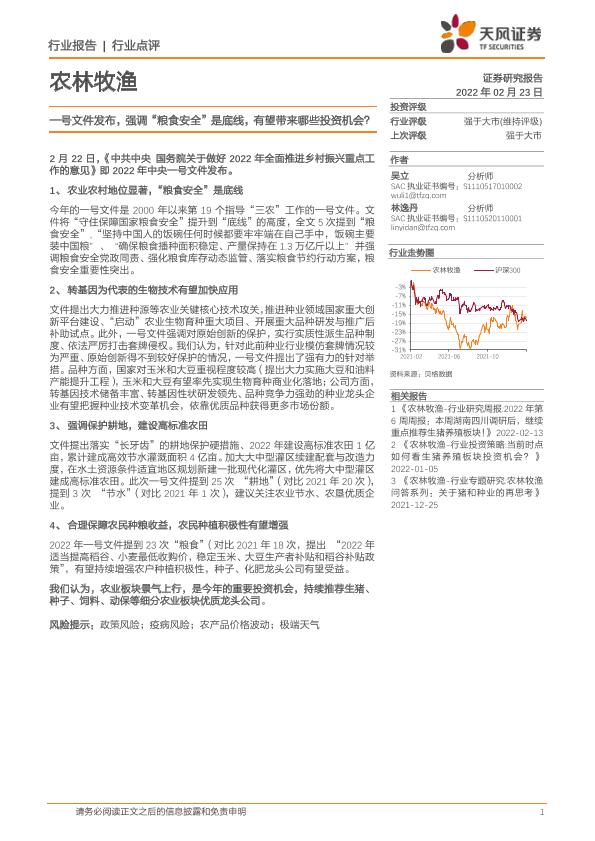 【天风证券】【20220223】20220223-天风证券-农林牧渔:一号文件发布,强调“粮食安全”是底线,有望带来哪些投资机会?-2页