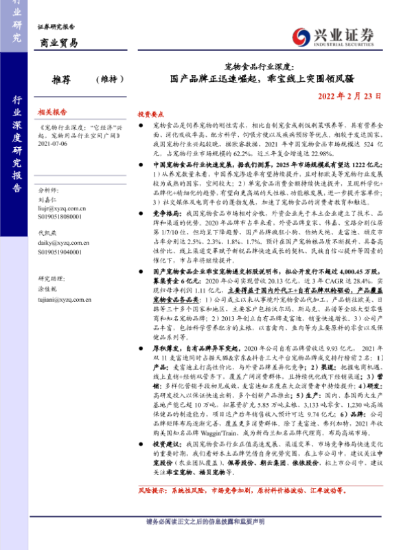 【兴业证券】【20220223】宠物食品行业深度:国产品牌正迅速崛起,乖宝线上突围领风骚-35页