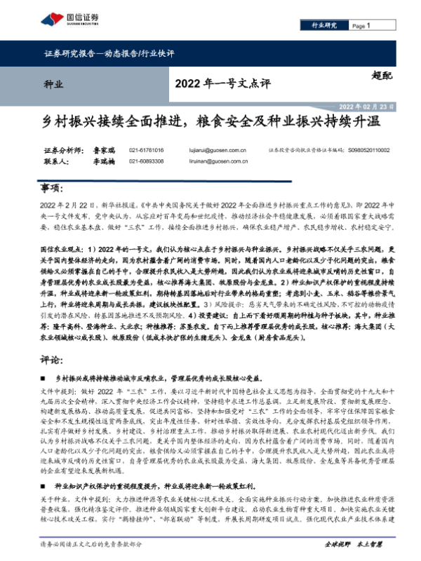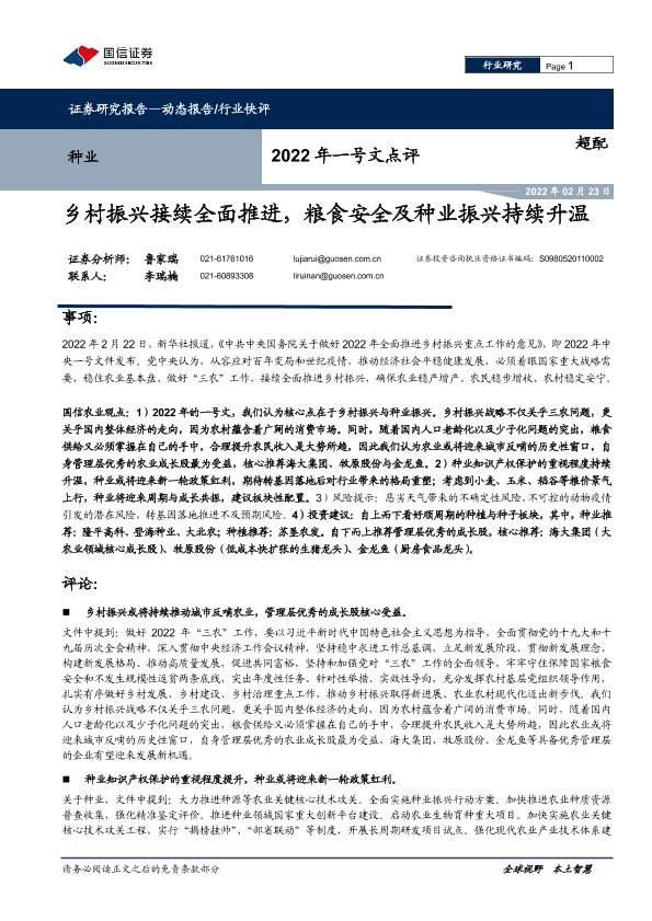 【国信证券】【20220223】种业2022年一号文点评:乡村振兴接续全面推进,粮食安全及种业振兴持续升温-5页