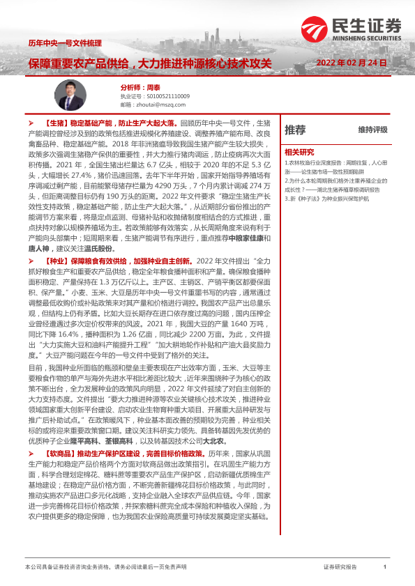 【民生证券】【20220224】农林牧渔历年中央一号文件梳理:保障重要农产品供给,大力推进种源核心技术攻关-7页