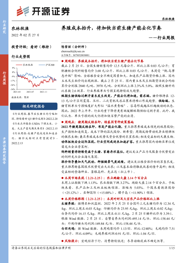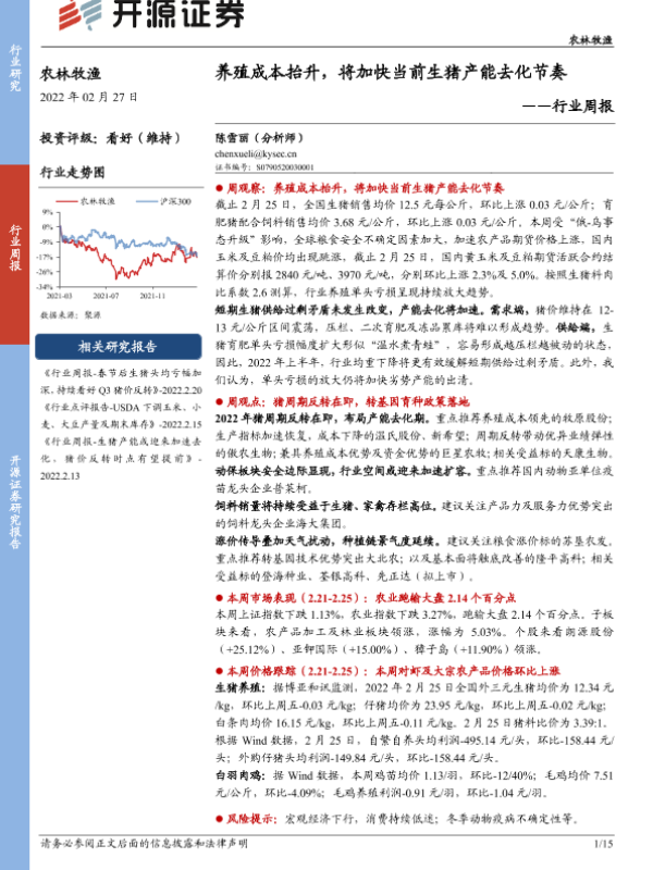 【开源证券】【20220227】农林牧渔行业周报:养殖成本抬升,将加快当前生猪产能去化节奏-15页