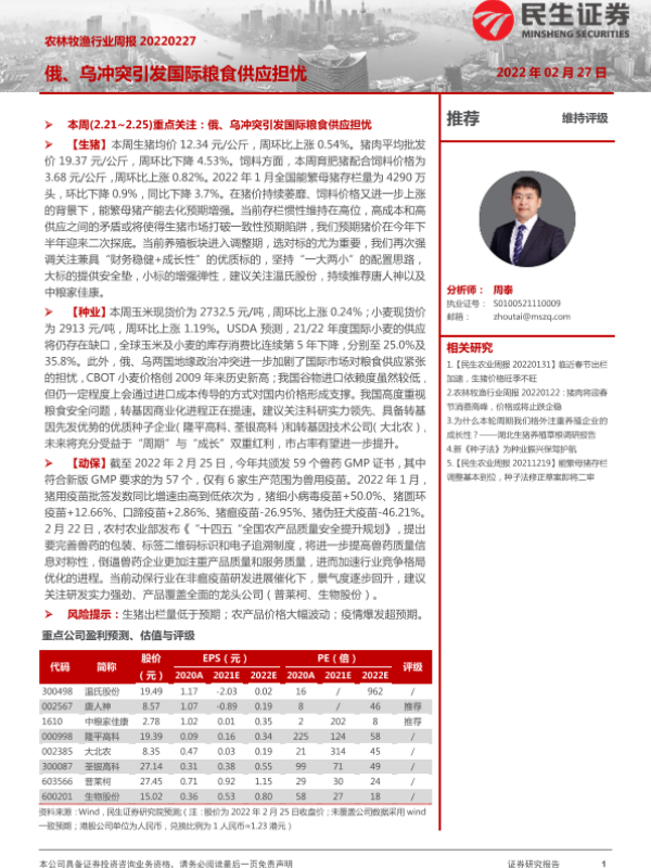 【民生证券】【20220227】20220227-民生证券-农林牧渔行业周报:俄、乌冲突引发国际粮食供应担忧-18页