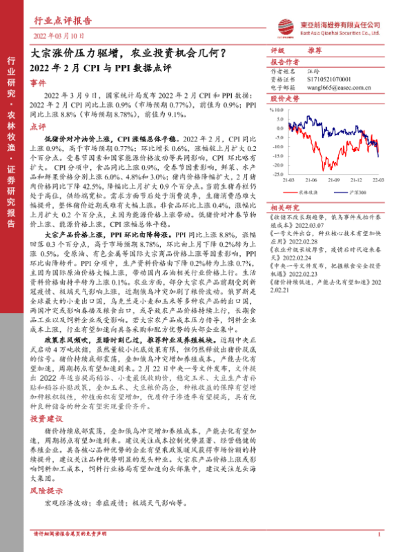 【东亚前海证券】【20220310】2022年2月CPI与PPI数据点评-大宗涨价压力驱增,农业投资机会几何?-3页