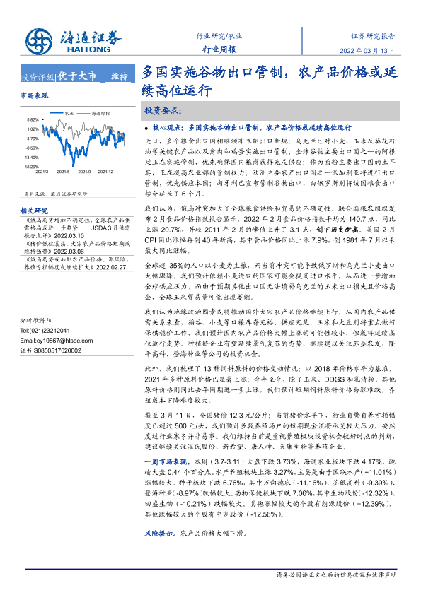 【海通证券】【20220313】20220313-海通证券-农业行业周报:多国实施谷物出口管制,农产品价格或延续高位运行-4页