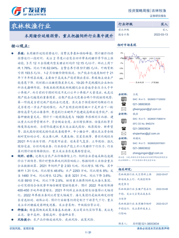 【广发证券】【20220313】20220313-广发证券-农林牧渔行业投资策略周报:本周猪价延续弱势,重点把握饲料行业集中提升-21页