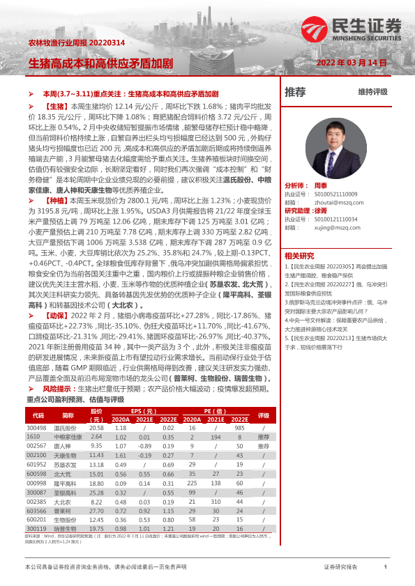 【民生证券】【20220314】20220314-民生证券-农林牧渔行业周报:生猪高成本和高供应矛盾加剧-19页