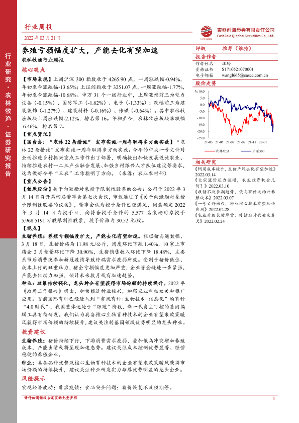 【东亚前海证券】【20220321】20220321-东亚前海证券-农林牧渔行业周报:养殖亏损幅度扩大,产能去化有望加速-17页