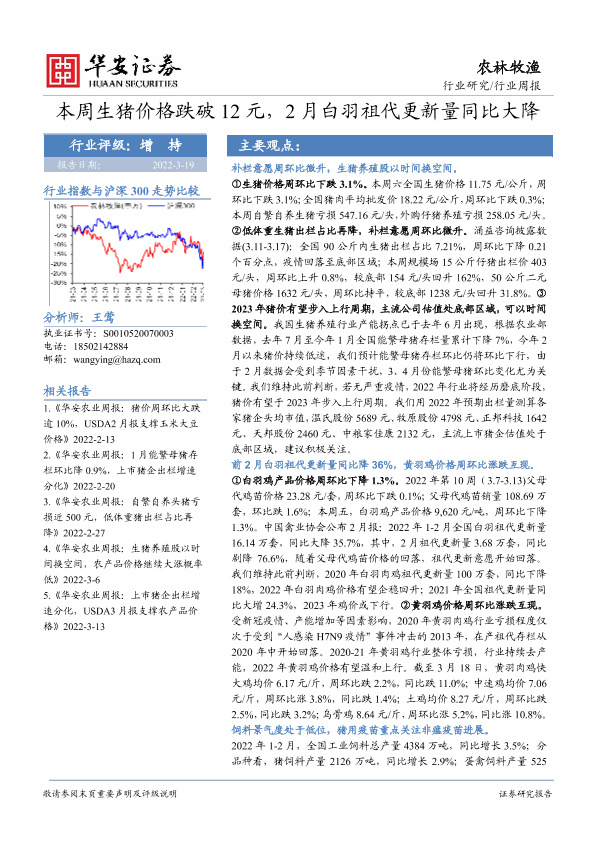 【华安证券】【20220319】20220319-华安证券-农林牧渔行业周报:本周生猪价格跌破12元,2月白羽祖代更新量同比大降-42页