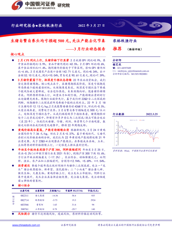 【银河证券】【20220327】20220327-中国银河-农林牧渔行业3月行业动态报告:生猪自繁自养头均亏损超500元,关注产能去化节奏-24页