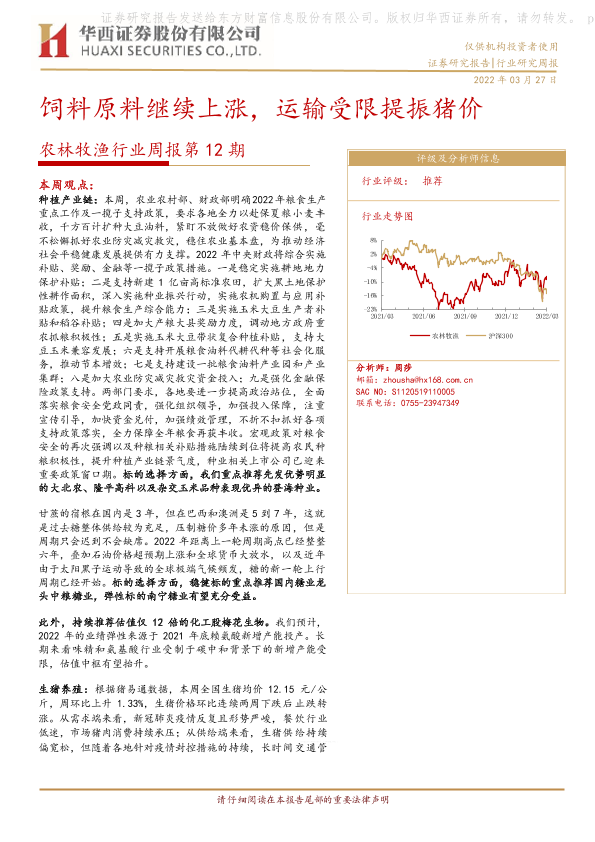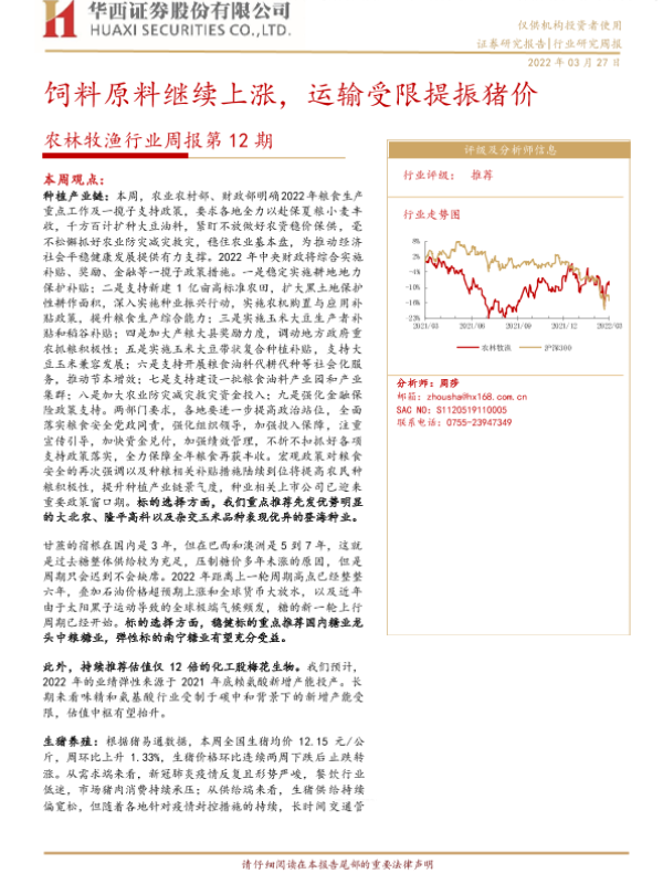 【华西证券】【20220327】农林牧渔行业周报第12期:饲料原料继续上涨,运输受限提振猪价-23页