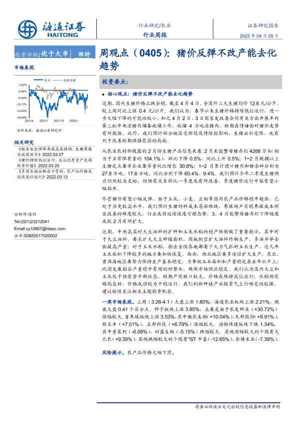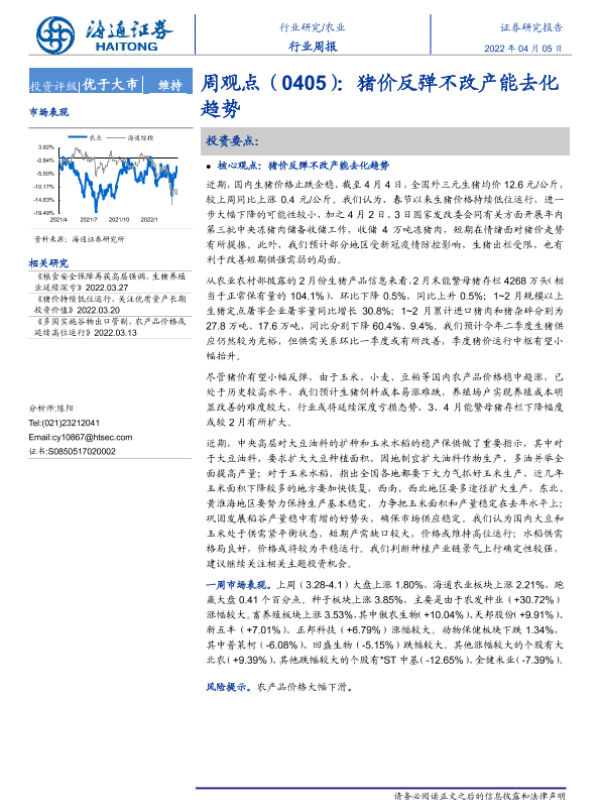 【海通证券】【20220405】农业周观点:猪价反弹不改产能去化趋势-4页