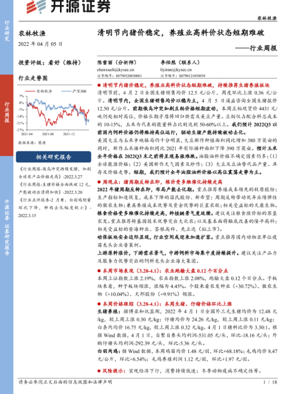 【开源证券】【20220405】20220405-开源证券-农林牧渔行业周报:清明节内猪价稳定,养殖业高料价状态短期难破-18页
