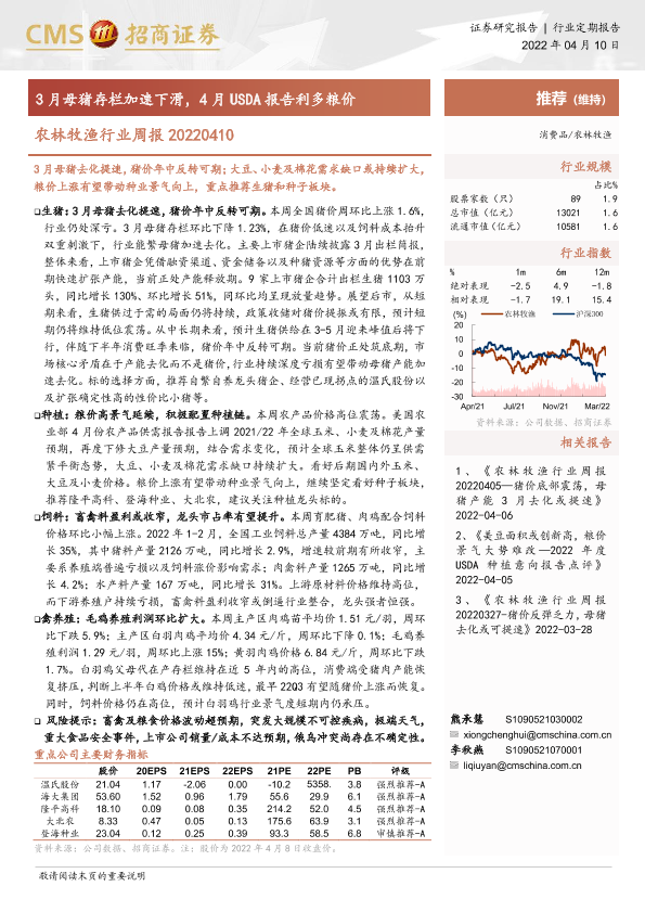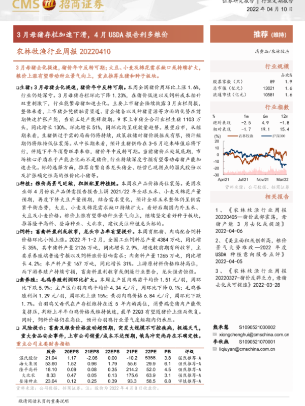 【海通证券】【20220410】农林牧渔行业周报:3月母猪存栏加速下滑,4月USDA报告利多粮价-12页