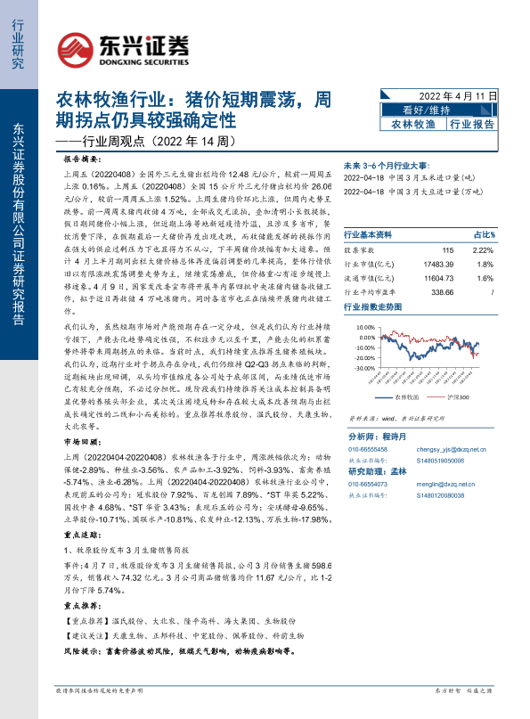 【东兴证券】【20220411】农林牧渔行业周观点(2022年14周):猪价短期震荡,周期拐点仍具较强确定性-13页