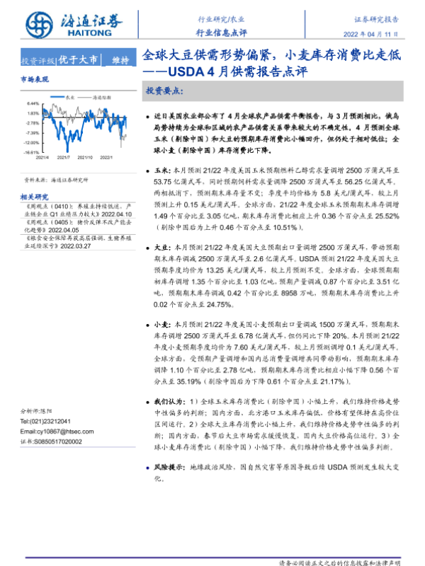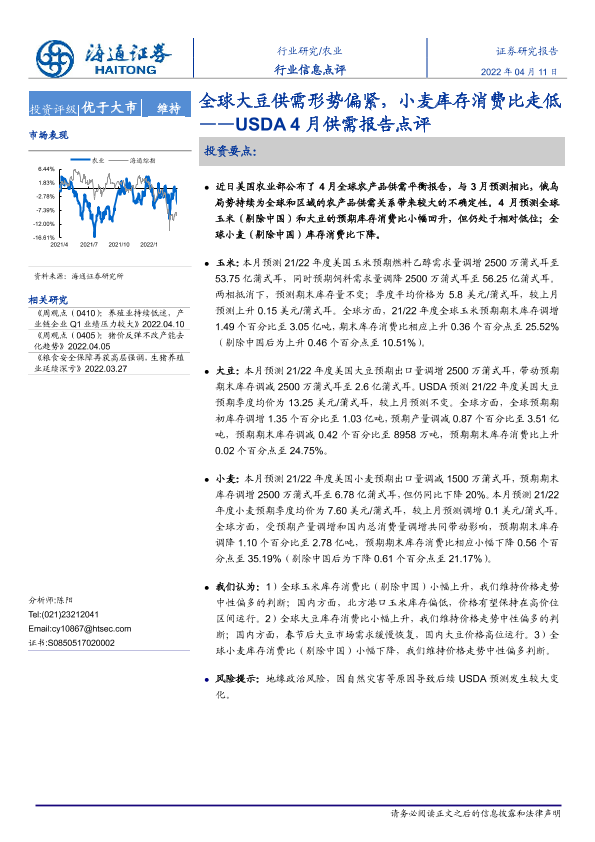 【海通证券】【20220411】农业USDA4月供需报告点评:全球大豆供需形势偏紧,小麦库存消费比走低-5页