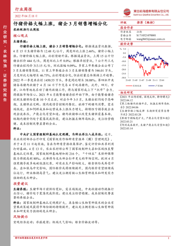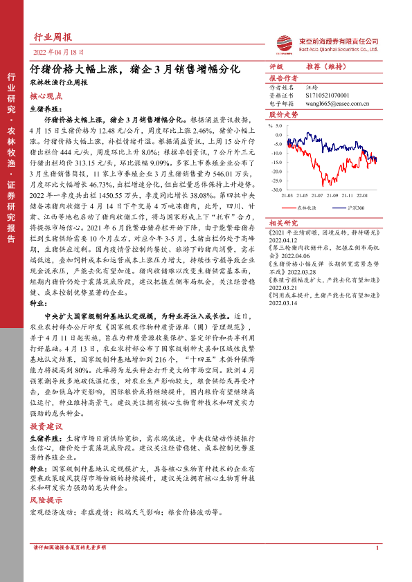【东亚前海证券】【20220418】20220418-东亚前海证券-农林牧渔行业周报:仔猪价格大幅上涨,猪企3月销售增幅分化-17页