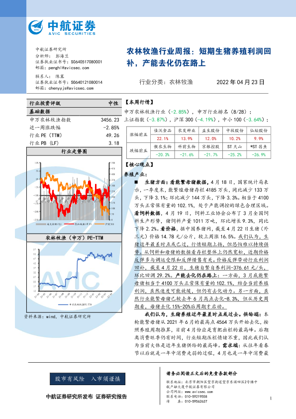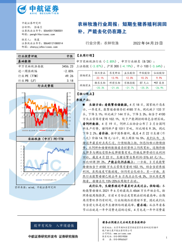 【中航证券】【20220423】农林牧渔行业周报:短期生猪养殖利润回补,产能去化仍在路上-11页