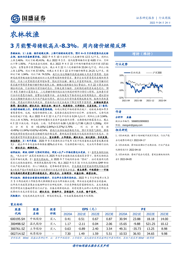 【国盛证券】【20220424】20220424-国盛证券-农林牧渔行业周报:3月能繁母猪较高点-8.3%,周内猪价继续反弹-18页
