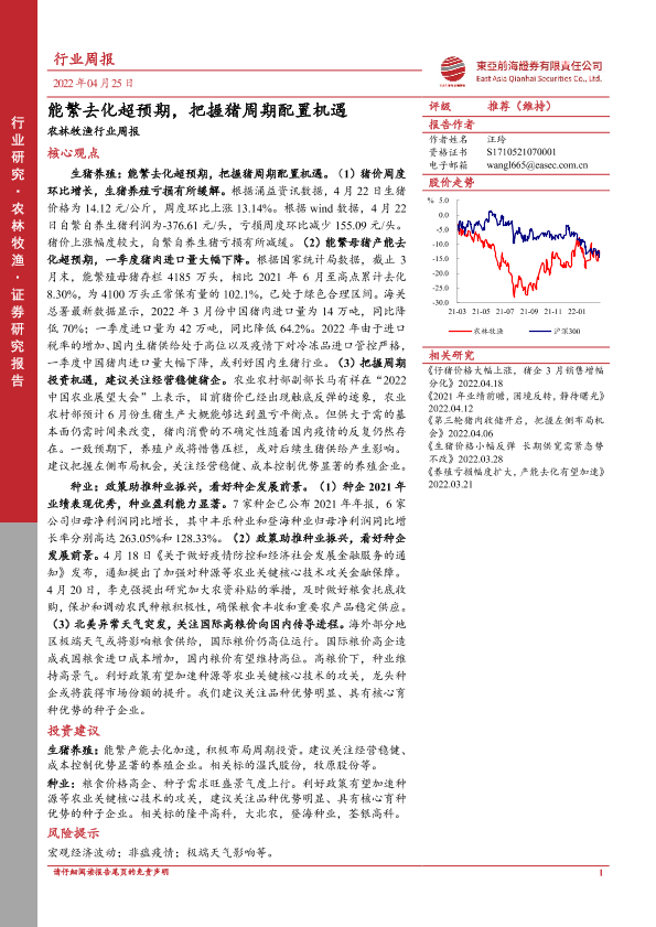 【东亚前海证券】【20220425】20220425-东亚前海证券-农林牧渔行业周报:能繁去化超预期,把握猪周期配置机遇-17页