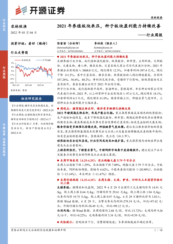 【开源证券】【20220504】20220504-开源证券-农林牧渔行业周报:2021年养殖板块承压,种子板块盈利能力持续改善-18页
