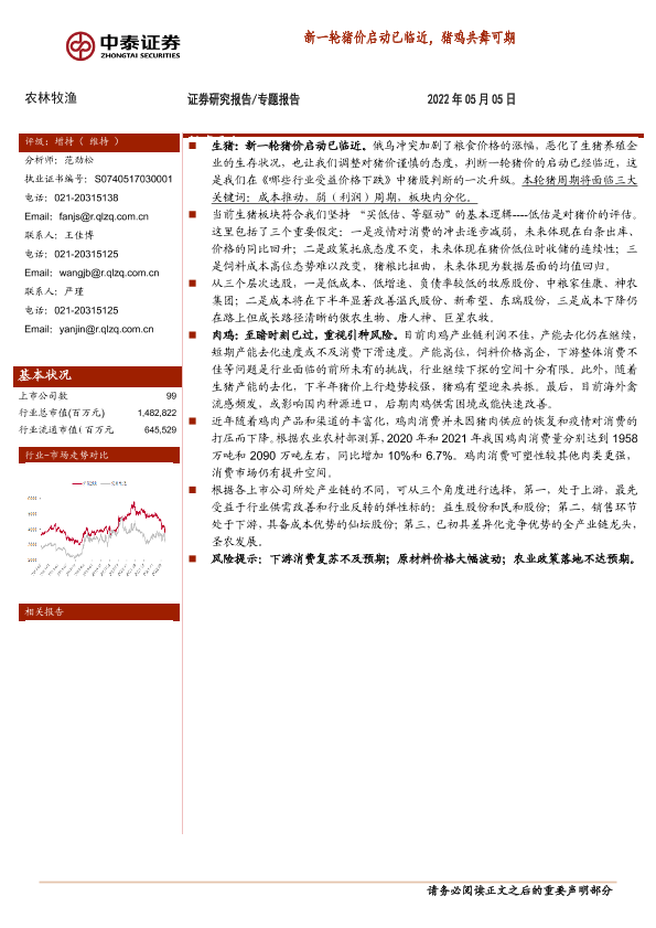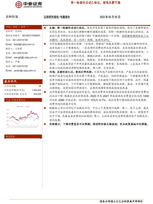 【中泰证券】【20220505】20220505-中泰证券-农林牧渔专题报告:新一轮猪价启动已临近,猪鸡共舞可期-9页
