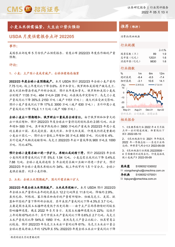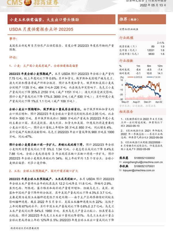 【海通证券】【20220513】农林牧渔USDA月度供需报告点评:小麦玉米供需偏紧,大豆出口势头强劲-5页