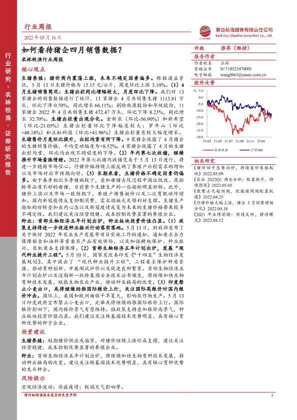 【东亚前海证券】【20220516】20220516-东亚前海证券-农林牧渔行业周报:如何看待猪企四月销售数据?-17页