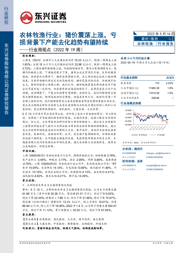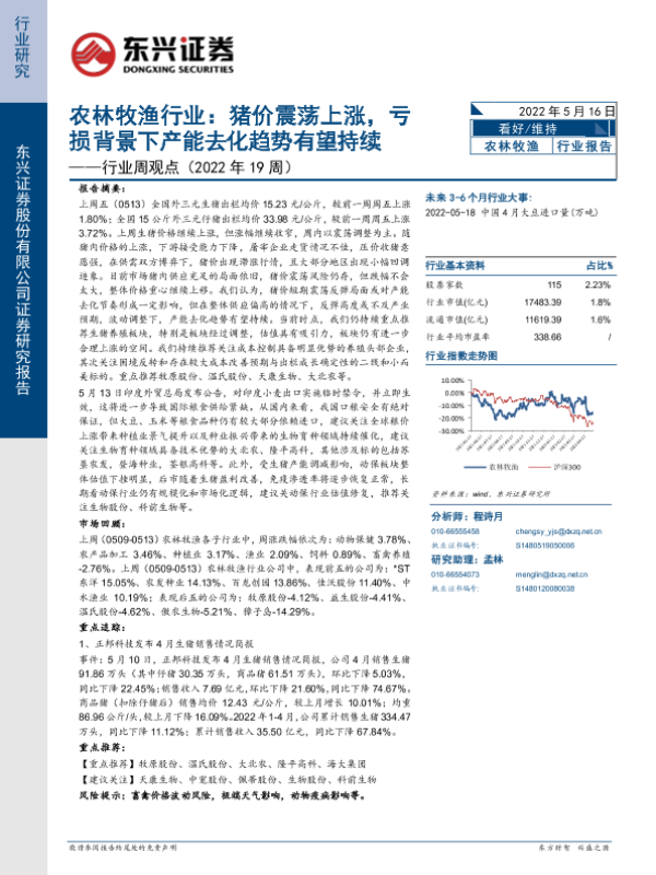 【东兴证券】【20220516】农林牧渔行业:猪价震荡上涨,亏损背景下产能去化趋势有望持续-13页