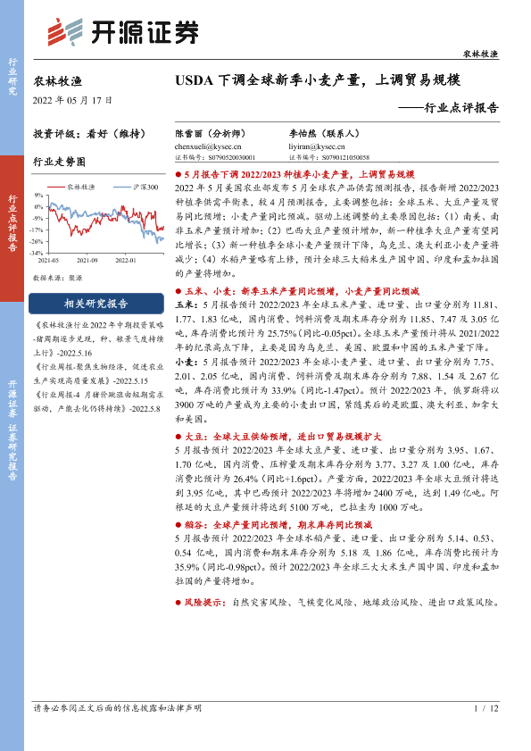 【开源证券】【20220517】农林牧渔行业点评报告:USDA下调全球新季小麦产量,上调贸易规模-12页