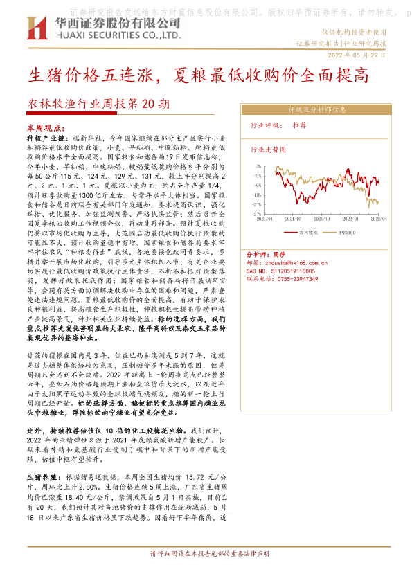 【华西证券】【20220522】20220522-华西证券-农林牧渔行业周报第20期:生猪价格五连涨,夏粮最低收购价全面提高-25页