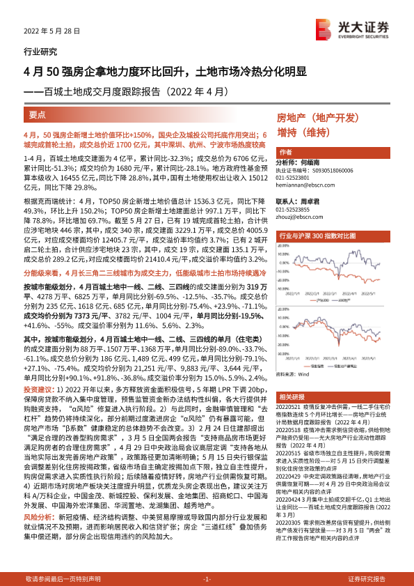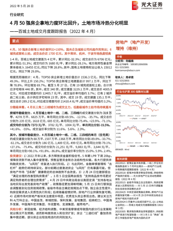 【光大证券】【20220528】房地产行业百城土地成交月度跟踪报告(2022年4月):4月50强房企拿地力度环比回升,土地市场冷热分化明显-16页