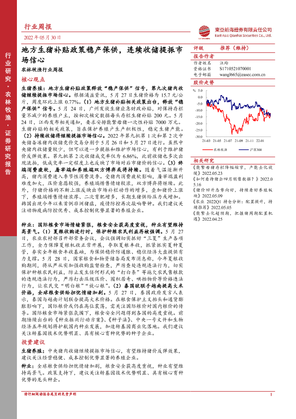 【东亚前海证券】【20220530】20220530-东亚前海证券-农林牧渔行业周报:地方生猪补贴政策稳产保供,连续收储提振市场信心-18页