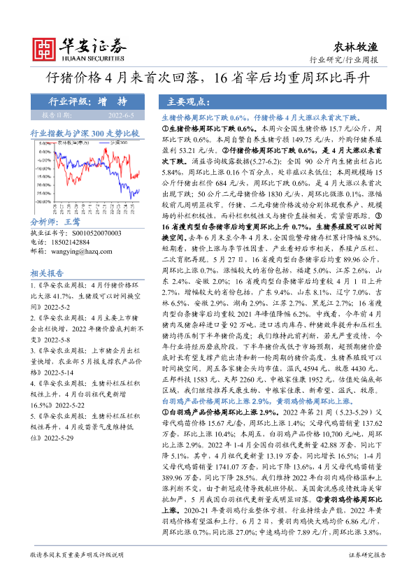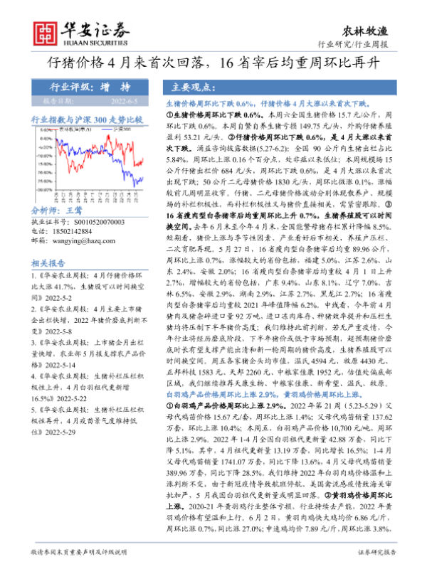 【华安证券】【20220605】20220605-华安证券-农林牧渔行业周报:仔猪价格4月来首次回落,16省宰后均重周环比再升-42页