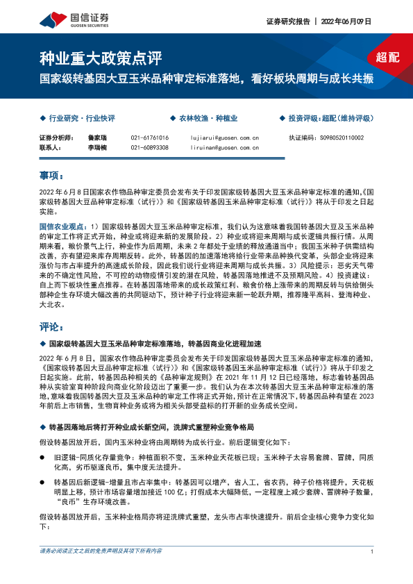 【国信证券】【20220609】种业重大政策点评:国家级转基因大豆玉米品种审定标准落地,看好板块周期与成长共振-5页
