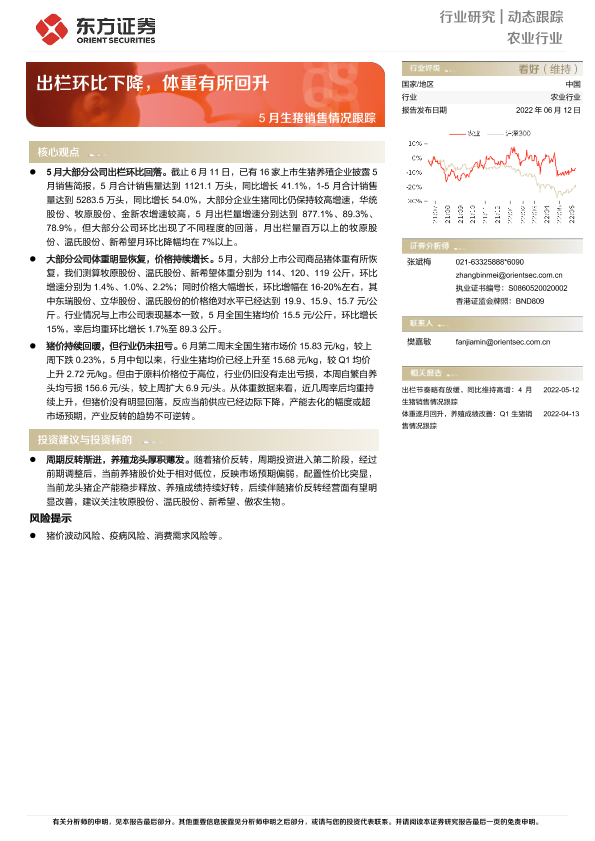 【东方证券】【20220612】5月生猪销售情况跟踪:出栏环比下降,体重有所回升-8页