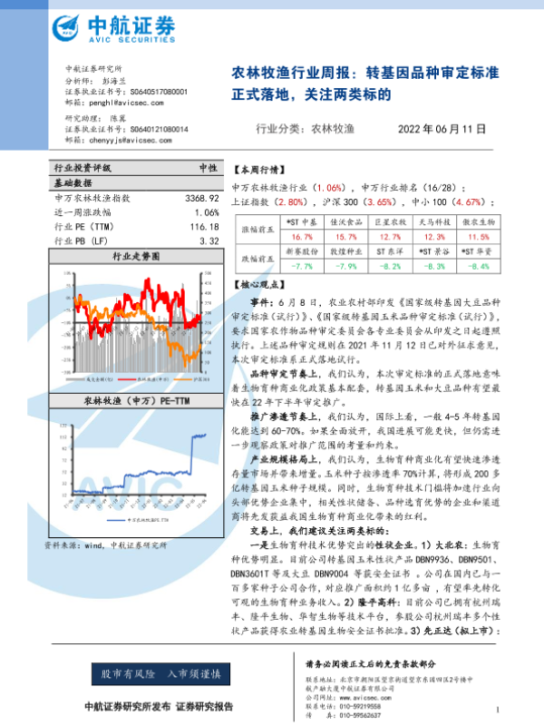 【中航证券】【20220611】农林牧渔行业周报:转基因品种审定标准正式落地,关注两类标的-12页