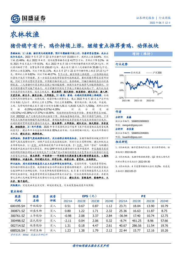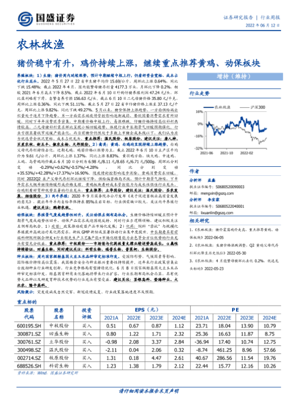 【国盛证券】【20220612】20220612-国盛证券-农林牧渔行业周报:猪价稳中有升,鸡价持续上涨,继续重点推荐黄鸡、动保板块-16页