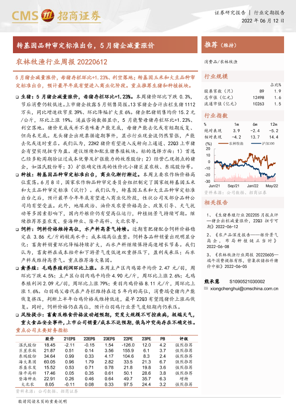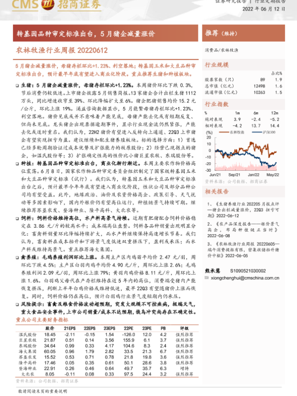 【海通证券】【20220612】农林牧渔行业周报:转基因品种审定标准出台,5月猪企减量涨价-11页