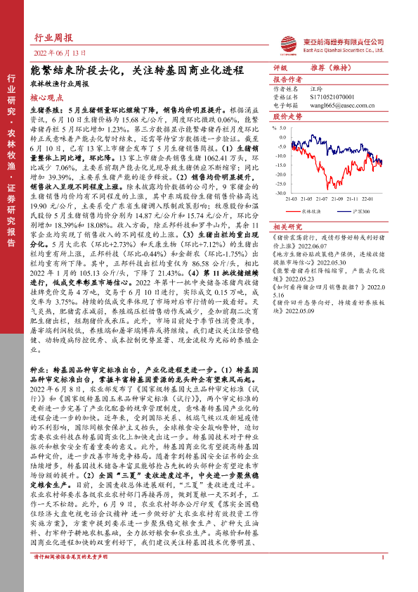 【东亚前海证券】【20220613】20220613-东亚前海证券-农林牧渔行业周报:能繁结束阶段去化,关注转基因商业化进程-19页