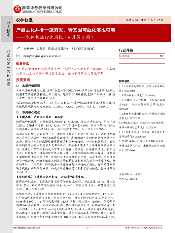 【浙商证券】【20220612】20220612-浙商证券-农林牧渔行业周报(6月第2周):产能去化并非一蹴而就,转基因商业化落地可期-17页