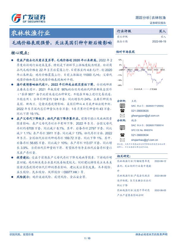 【广发证券】【20220619】20220619-广发证券-农林牧渔行业跟踪分析:毛鸡价格表现强势,关注美国引种中断后续影响-10页