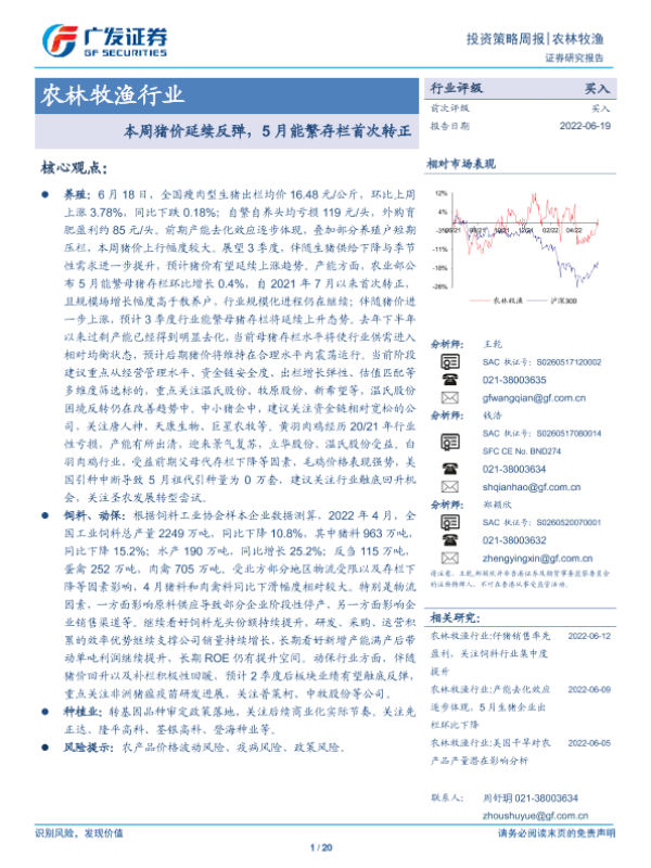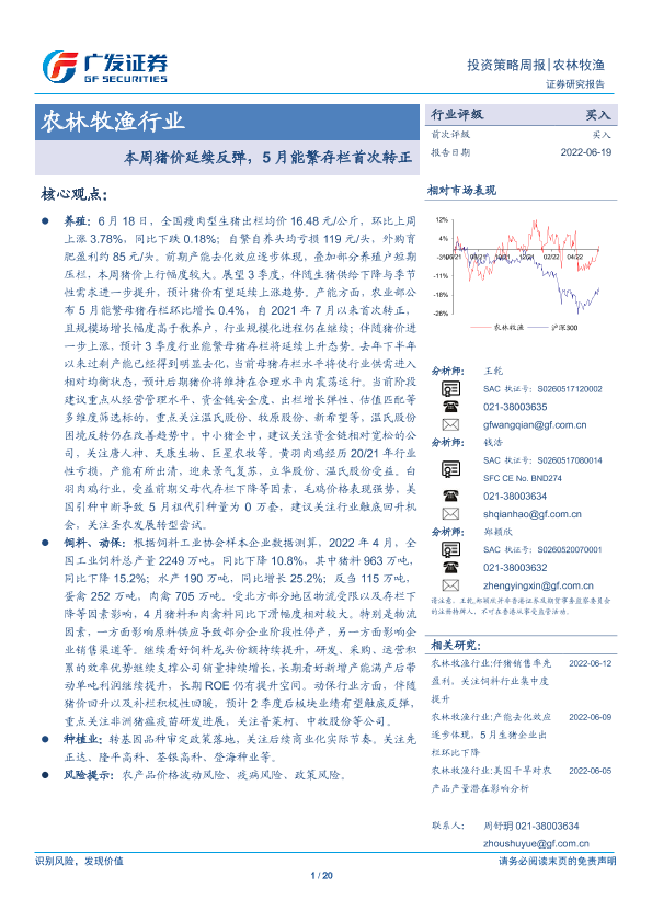 【广发证券】【20220619】20220619-广发证券-农林牧渔行业投资策略周报:本周猪价延续反弹,5月能繁存栏首次转正-20页