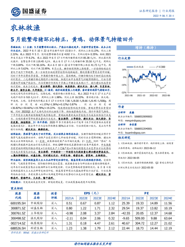 【国盛证券】【20220620】20220620-国盛证券-农林牧渔:5月能繁母猪环比转正,黄鸡、动保景气持续回升-16页