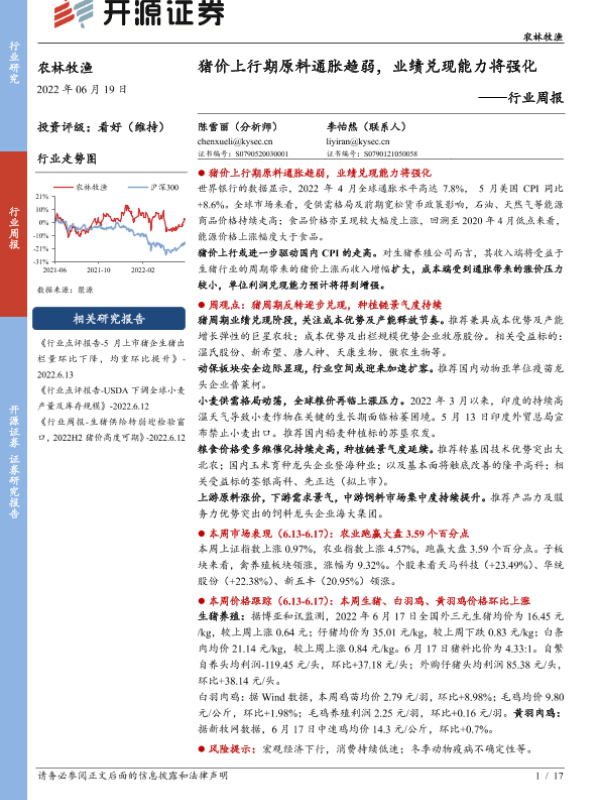 【开源证券】【20220619】20220619-开源证券-农林牧渔行业周报:猪价上行期原料通胀趋弱,业绩兑现能力将强化-17页