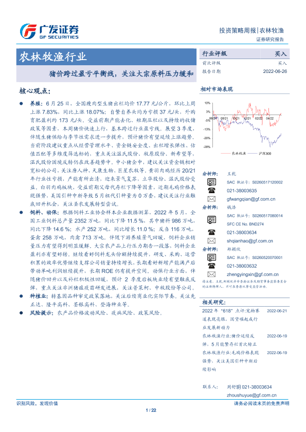 【广发证券】【20220626】20220626-广发证券-农林牧渔行业投资策略周报:猪价跨过盈亏平衡线,关注大宗原料压力缓和-22页
